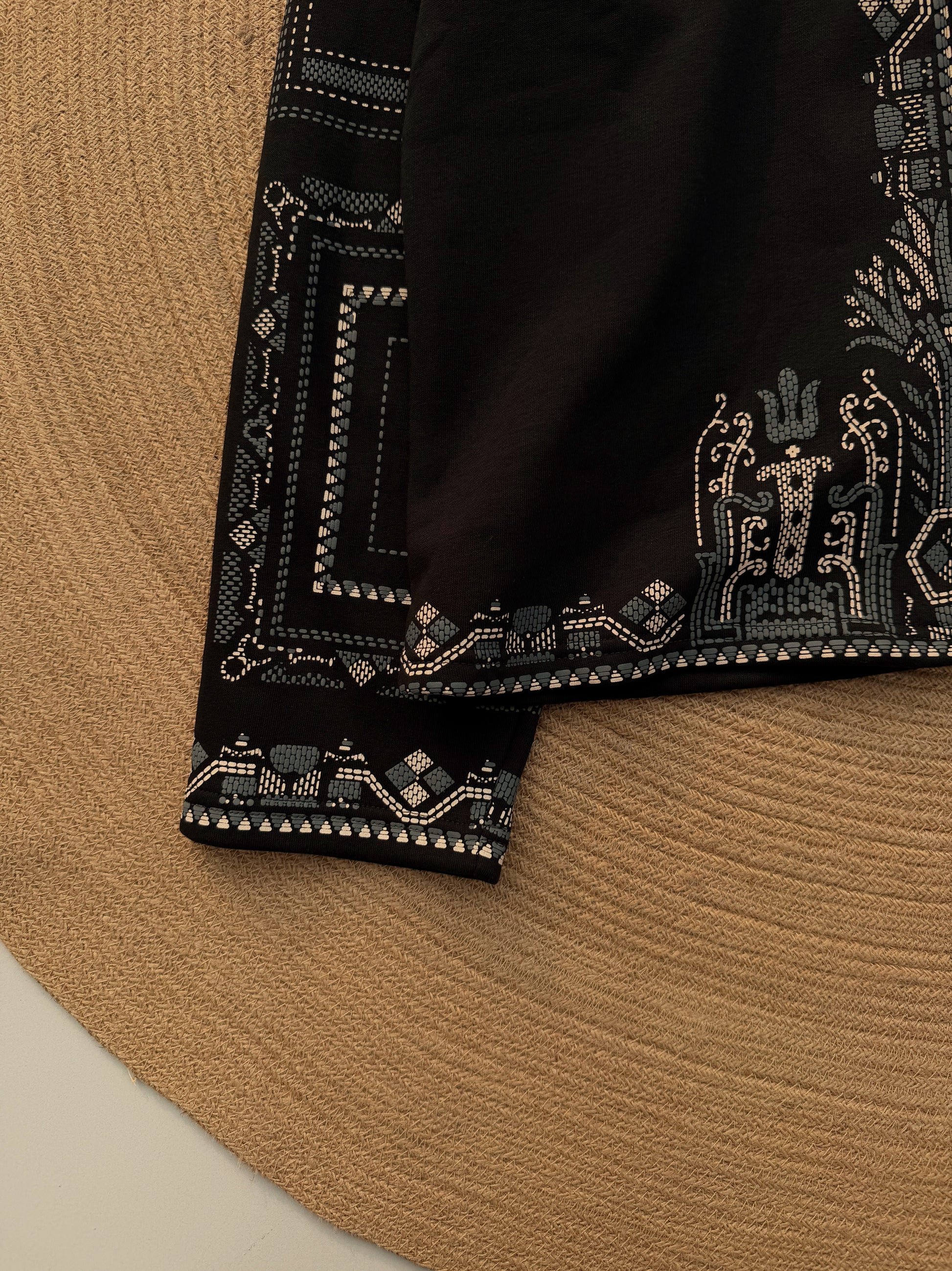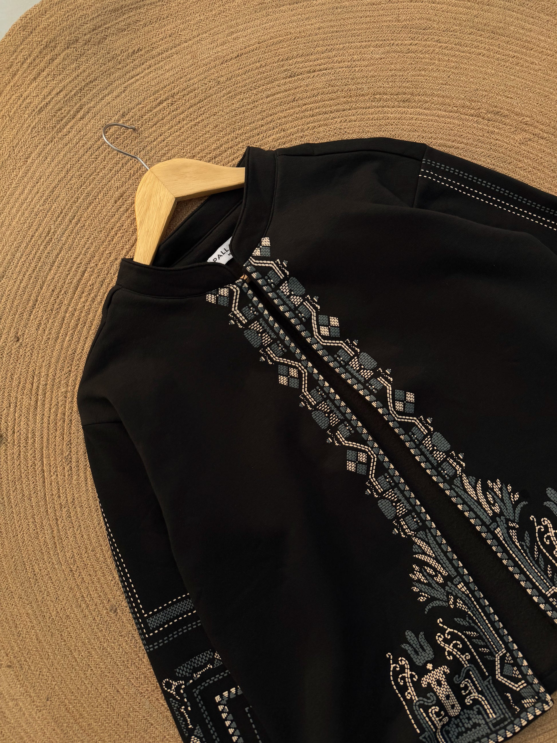 Make a statement this winter with our Midnight Deal Jacket. Featuring deep Fleece fabric contrasted with intricate silver-blue geometric rubber print, this piece is designed for those who appreciate timeless craftsmanship. 🖤